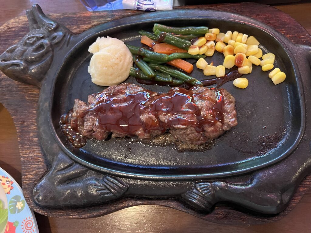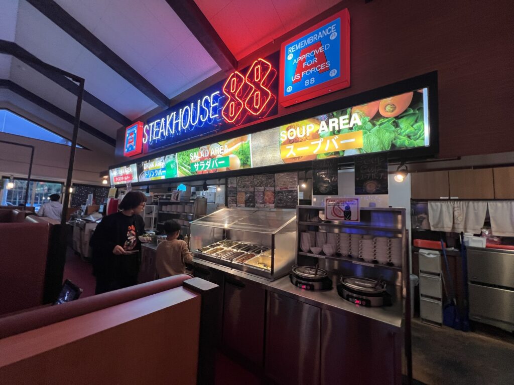 ステーキを頼むと サラダバー ライス スープはついてきます。
